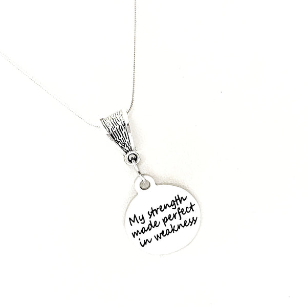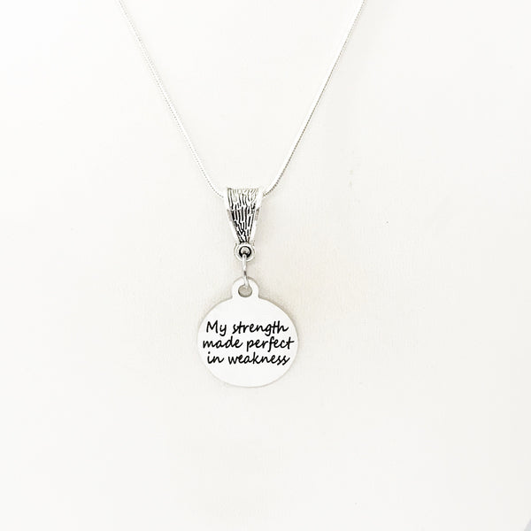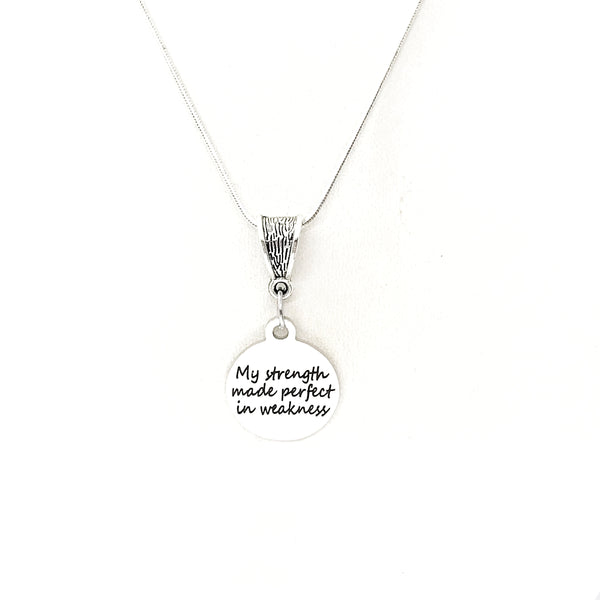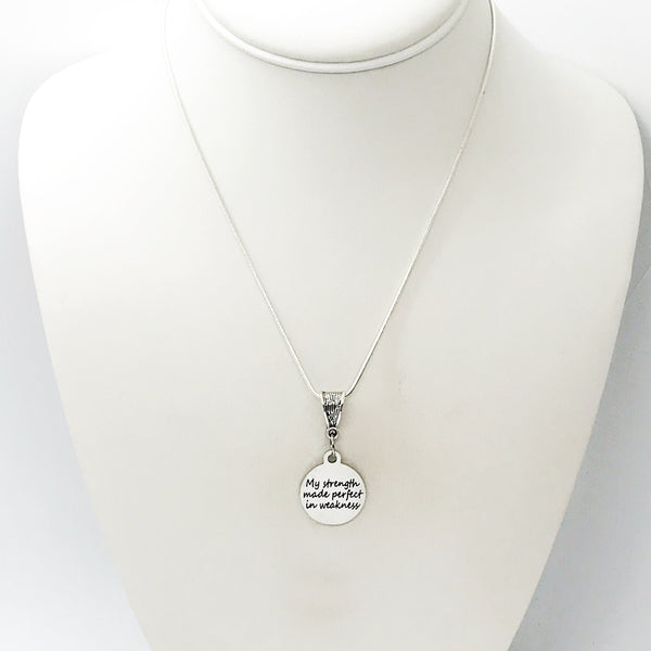 This is a laser engraved stainless steel pendant on a silver-plated snake chain. The pendant has the phrase "My strength made perfect in weakness" From 2 Corinthians 12:9. This pendant is available on your choice of 16, 18, 20, 22, 24, 26, 28 or 30 inch chain. The pendant is also available for individual purchase if you have another chain on which you would like to wear it.