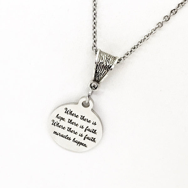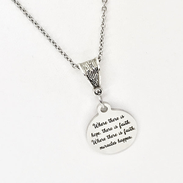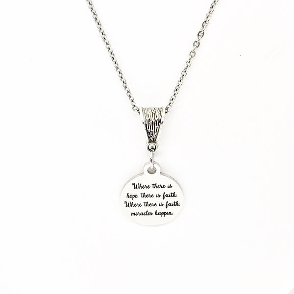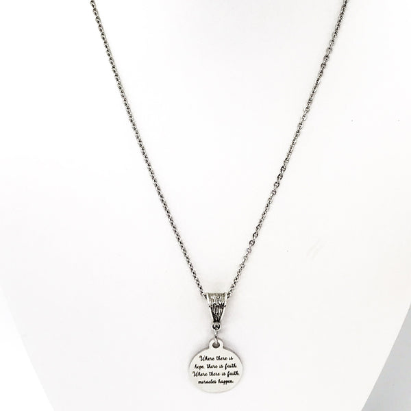 This necklace is a simple but beautiful gift for a loved one in your life. It is a stainless steel laser engraved charm on a stainless steel link chain with a silver-tone bale. The charm has the following on it: