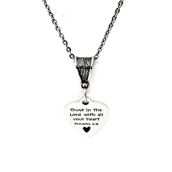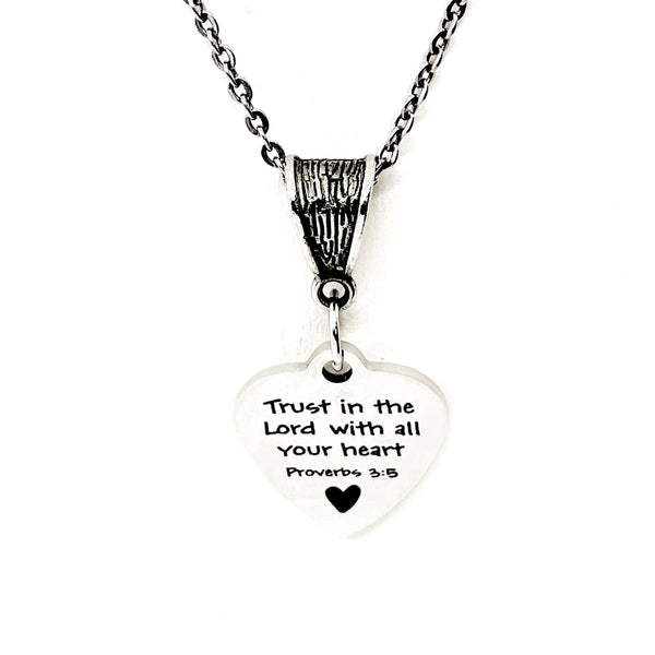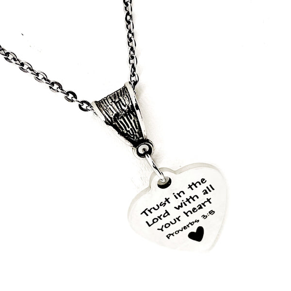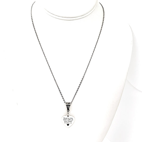 This beautiful necklace would make a great love jewelry piece. The pendant is a stainless steel laser engraved charm with “Trust in the Lord with all your heart” from Proverbs 3:5 on it with a silver-tone bail.