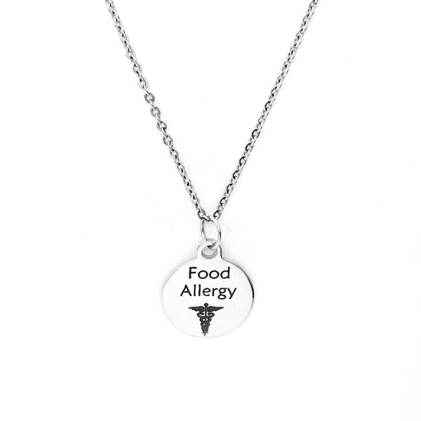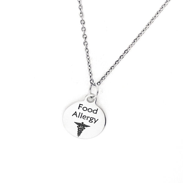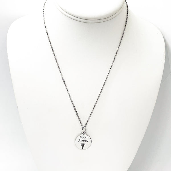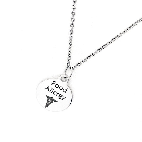 This is a stainless steel laser engraved pendant on a stainless steel chain. The pendant has “Food Allergy” and a medical caduceus symbol on it. This pendant is available on your choice of 16, 18, 20, 22, 24, 26, 28 or 30 inch chain. The pendant is also available for individual purchase if you have another chain on which you would like to wear it. For an additional charge, the charm can be customized to meet your specific needs.