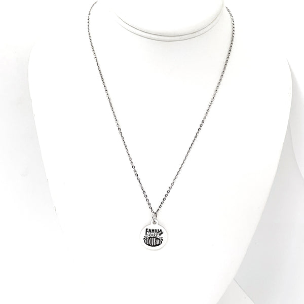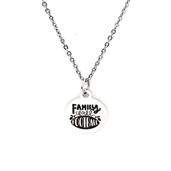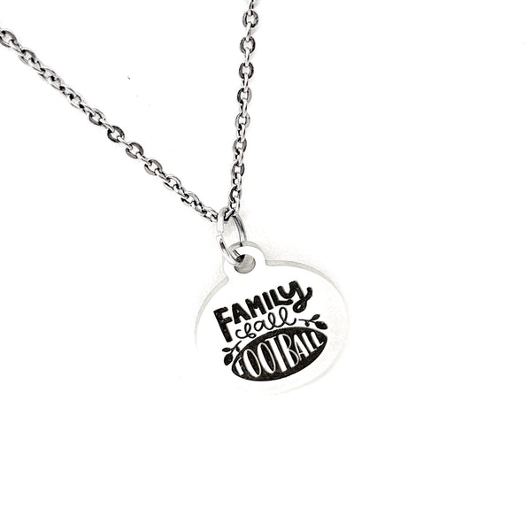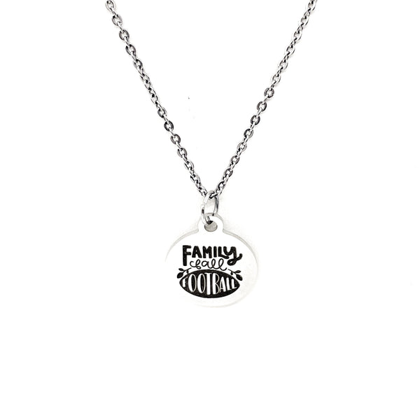 This beautiful necklace would make a great love jewelry piece. The pendant is a stainless steel laser engraved charm with “Family Fall Football” on it.