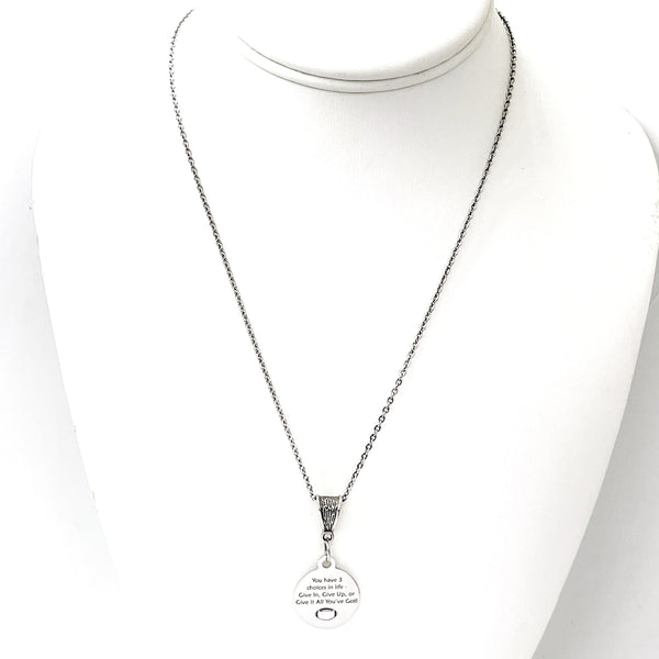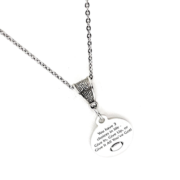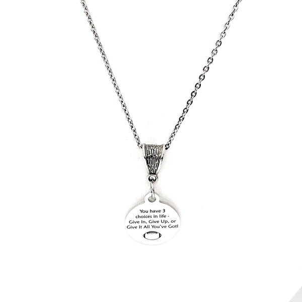 This is a stainless steel laser engraved pendant on a stainless steel link chain. The pendant says “You have 3 choices in life - Give In, Give Up, or Give It All You’ve Got” with a football image.