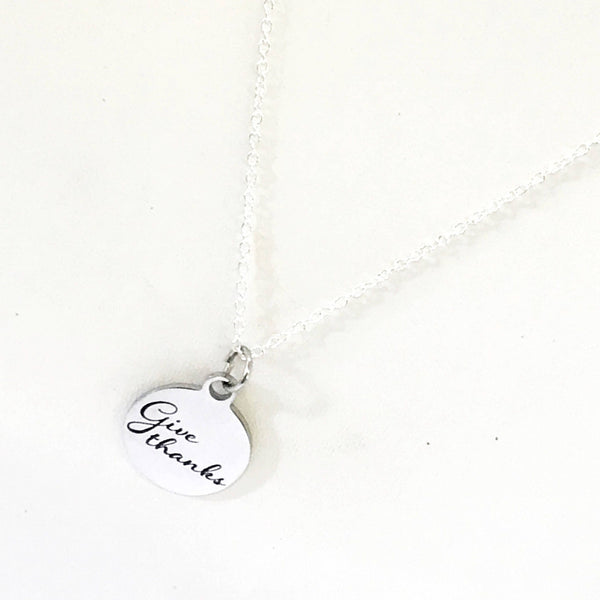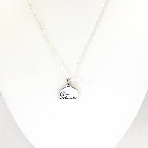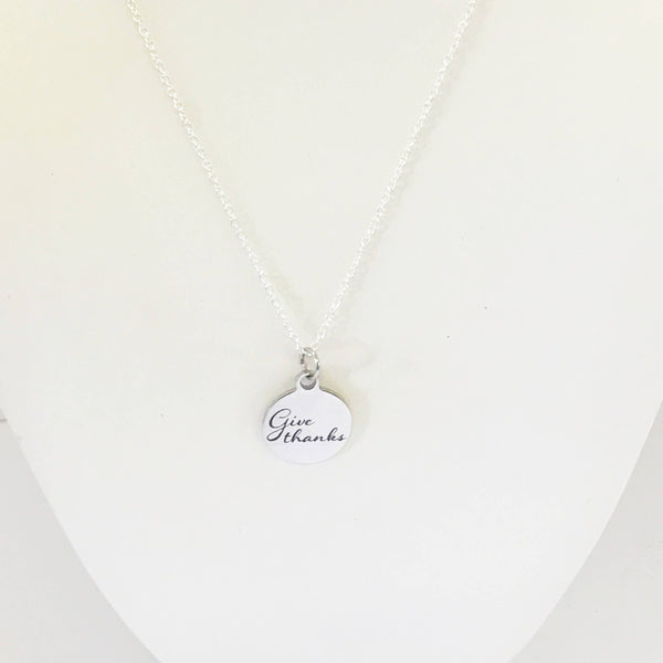This is a stainless steel laser engraved pendant on a sterling silver plated chain. The pendant has "Give Thanks" on it. This pendant is available on your choice of 16, 18, 20, 22, 24, 26, 28 or 30 inch sterling silver plated link chain. The pendant is also available for individual purchase if you have another chain on which you would like to wear it.