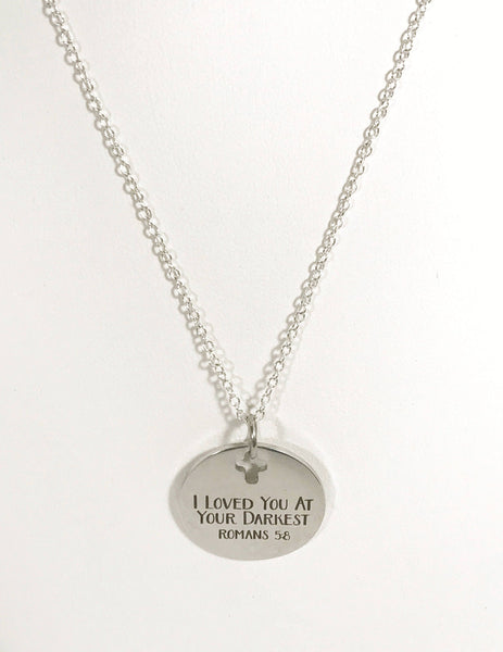 This silver necklace is a simple but beautiful encouragement gift. The stainless steel laser engraved pendant has "I loved you at your darkest" from Romans 5:8 on it.