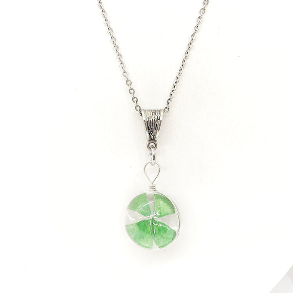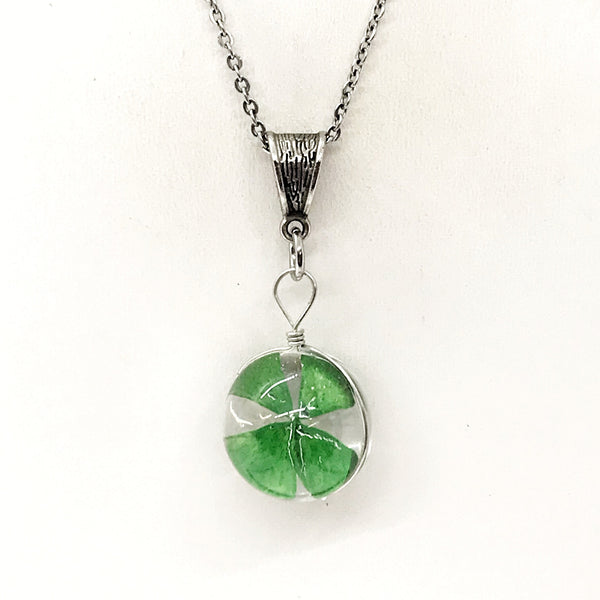 This necklace is a simple but beautiful gift for a loved one in your life. It is a stainless steel chain with a glass four leaf clover pendant.