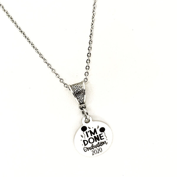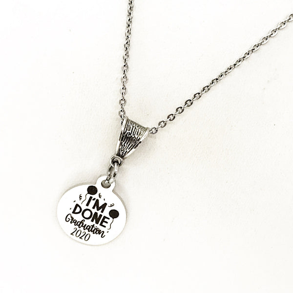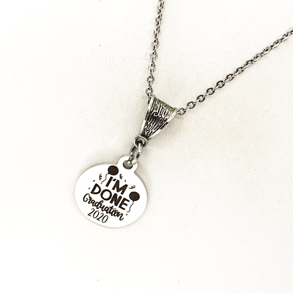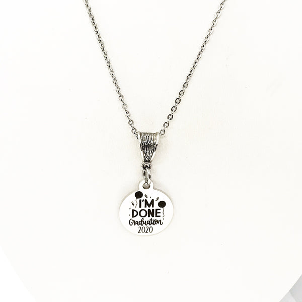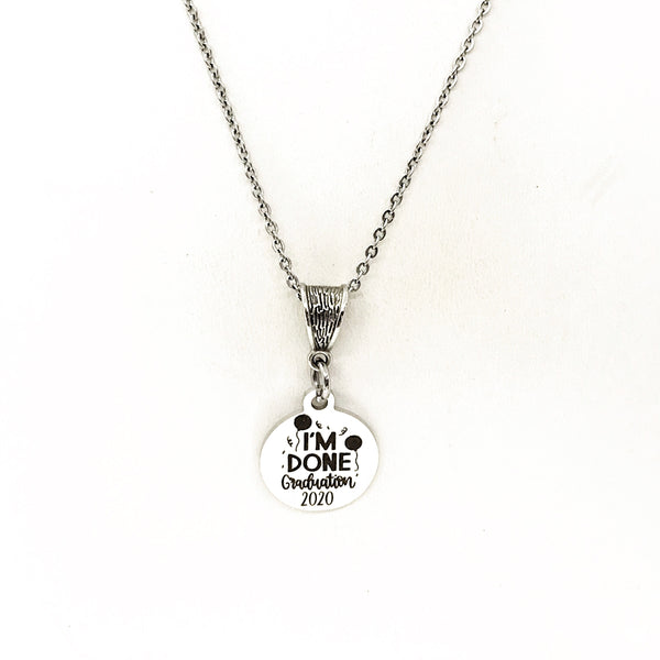 This necklace is a simple but beautiful gift for a loved one in your life. It is a stainless steel laser engraved charm on a stainless steel link chain with a silver-tone bale. The charm has “I’m Done Graduation 2020” on it.