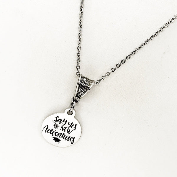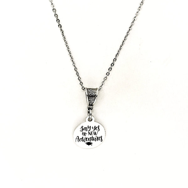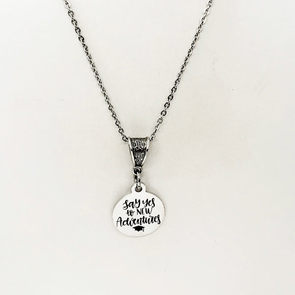 The is a beautiful jewelry piece that has a stainless steel laser engraved charm with the following on it “Say yes to new adventures”