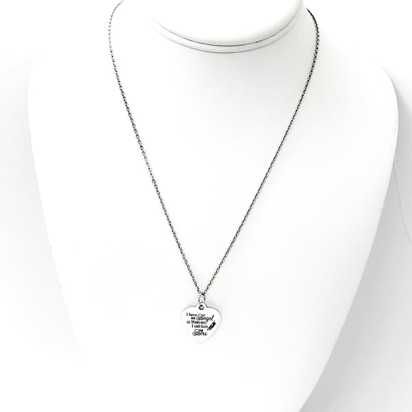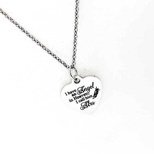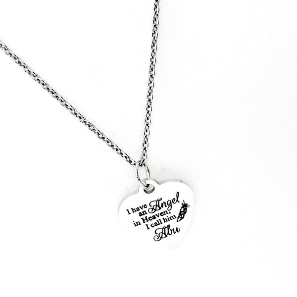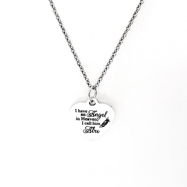 This is a stainless steel laser engraved pendant on a stainless steel chain. The pendant has “I have an angel in heaven. I call him Abu” on it. This pendant is available on your choice of 16, 18, 20, 22, 24, 26, 28 or 30 inch chain. The pendant is also available for individual purchase if you have another chain on which you would like to wear it. For an additional charge, the charm can be customized to meet your specific needs.