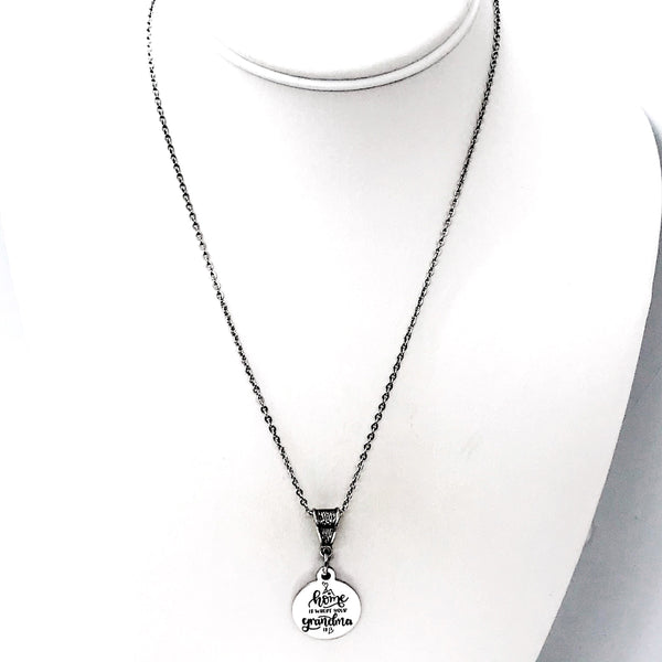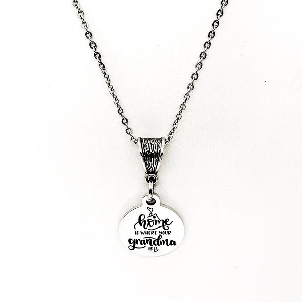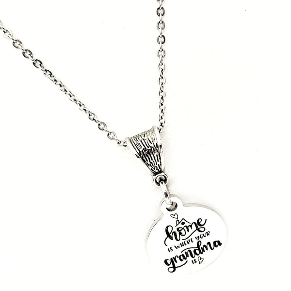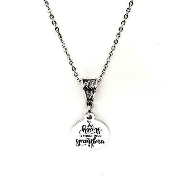 The is a beautiful jewelry piece that has a stainless steel laser engraved charm with “Home is where your Grandma is” on it. The charm measures approx. 3/4 inch across.