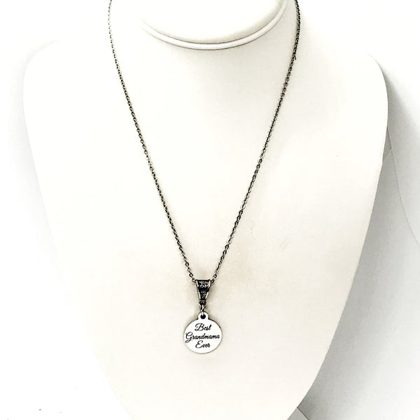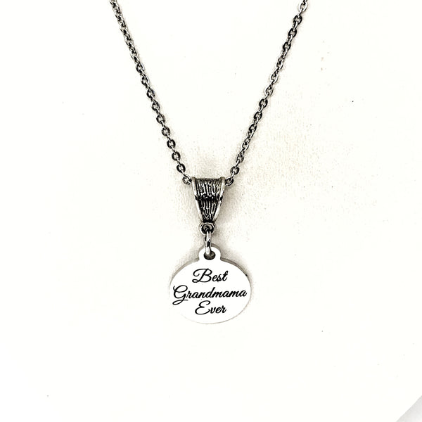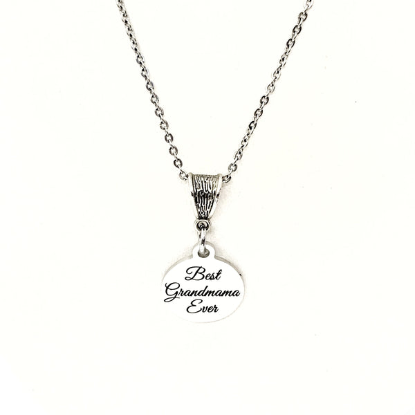The is a beautiful jewelry piece that has a stainless steel laser engraved charm with “Best Grandmama Ever” on it. The charm measures approx. 3/4 inch across.