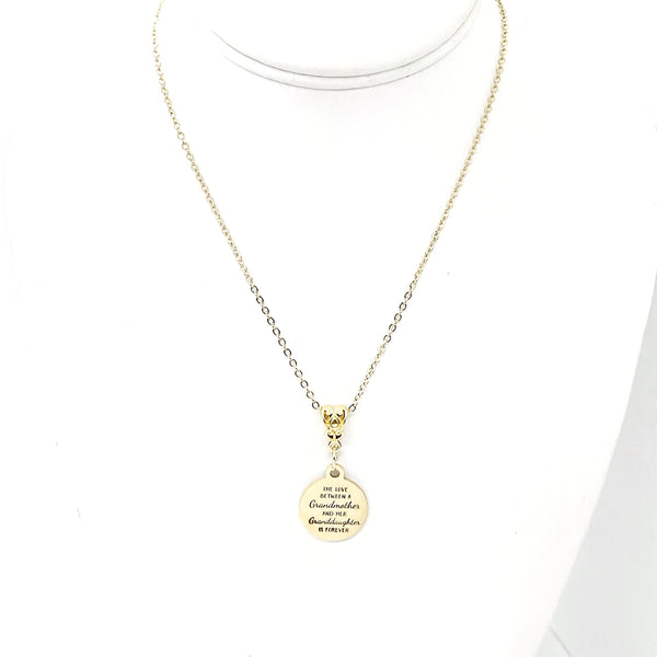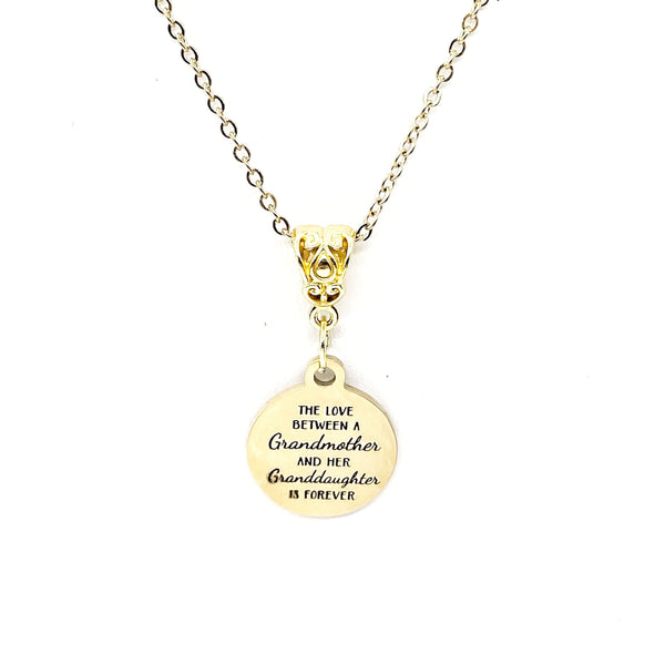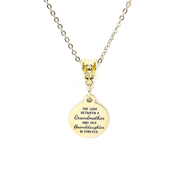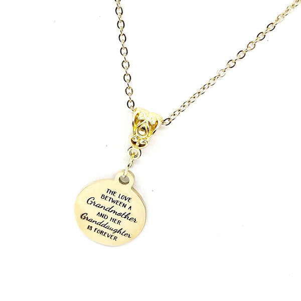 This is a Gold-plated brass necklace with a Gold-plated stainless steel laser engraved pendant with "The love between a grandmother and her granddaughter is forever" on it. This pendant is available on your choice of 16, 18, 20, 22, 24, 26, 28 or 30 inch chain.