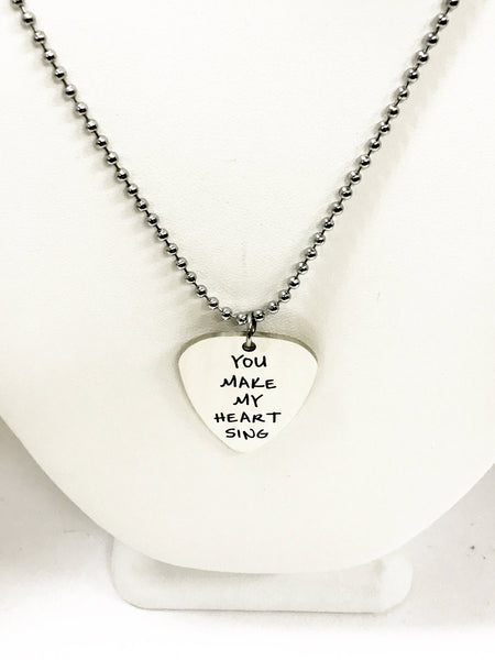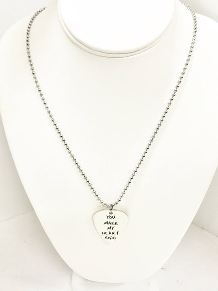 The pendant is a laser engraved guitar pick charm on a 24 inch stainless steel ball chain. The charm has the following on it: