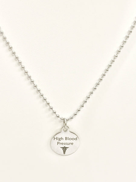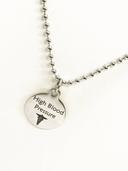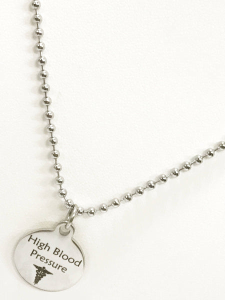 The pendant is a stainless steel laser engraved High Blood Pressure charm and comes on a 23 inch ball chain. The pendant is also available for individual purchase if you have another chain on which you would like to wear it.