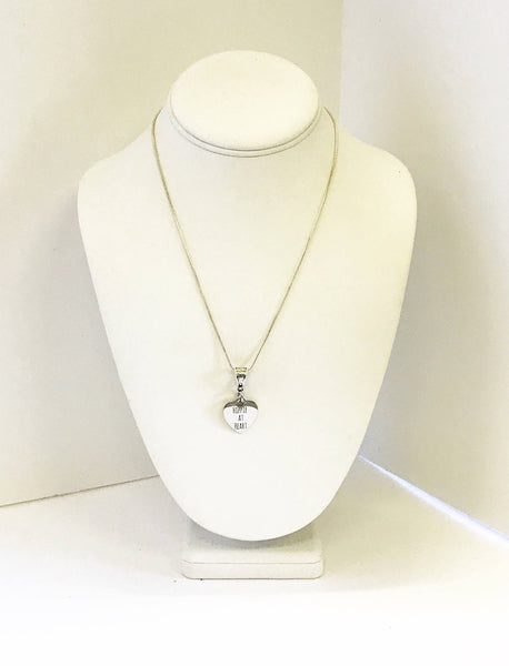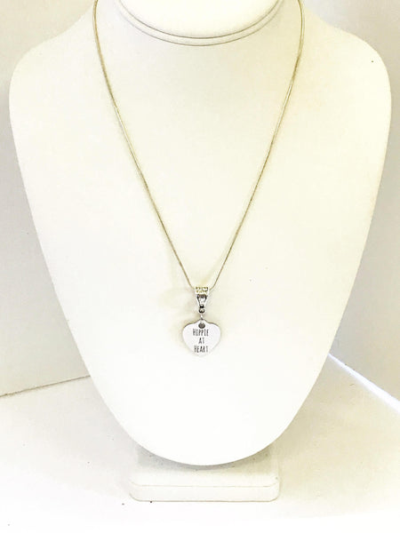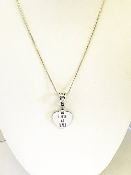 This is a stainless steel laser engraved pendant on a sterling silver plated chain. The pendant has "Hippie At Heart" on it. This pendant is available on your choice of 16, 18, 20, 22, 24, 26, 28 or 30 inch chain. The pendant is also available for individual purchase if you have another chain on which you would like to wear it.