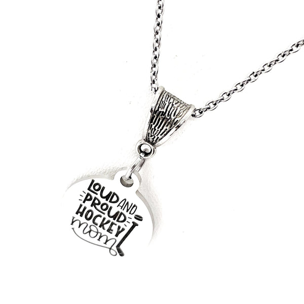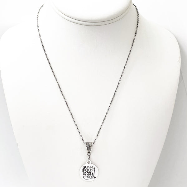 This is a stainless steel laser engraved pendant on a stainless steel link chain. The pendant says “Loud and Proud Hockey Mom”.
