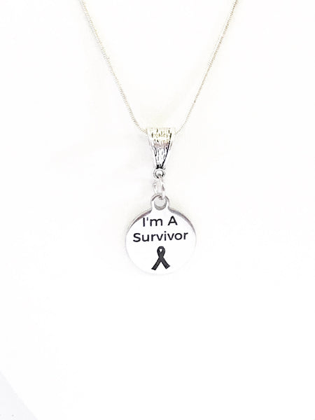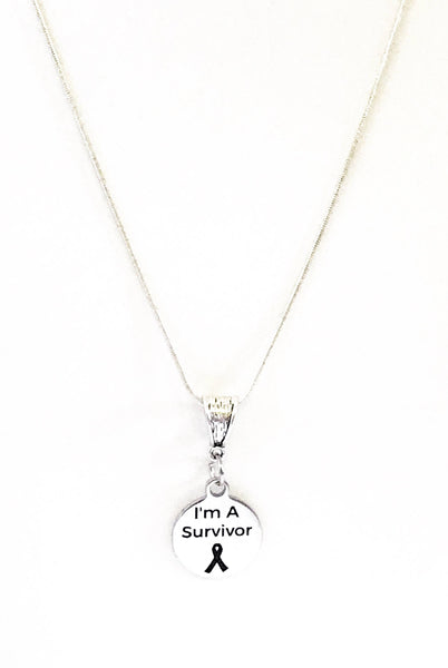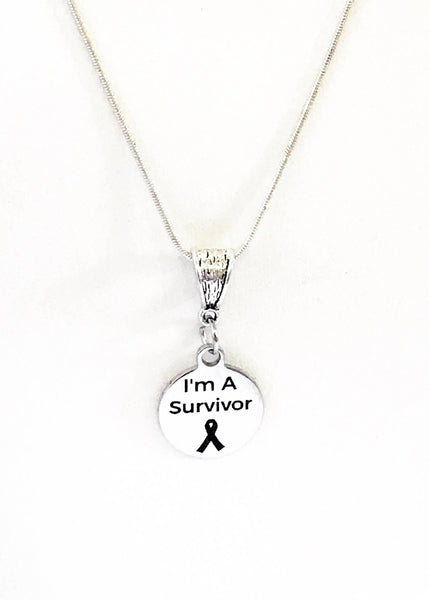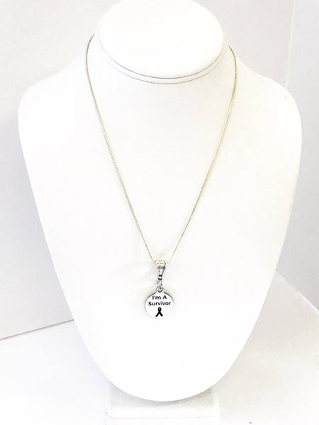 This is a stainlses steel laser engraved pendant on a sterling silver plated chain. The pendant has "I Am A Survivor" and the Cancer Awareness symbol on it. This pendant is available on your choice of 16, 18, 20, 22, 24, 26, 28 or 30 inch sterling silver chain. The pendant is also available for individual purchase if you have another chain on which you would like to wear it.