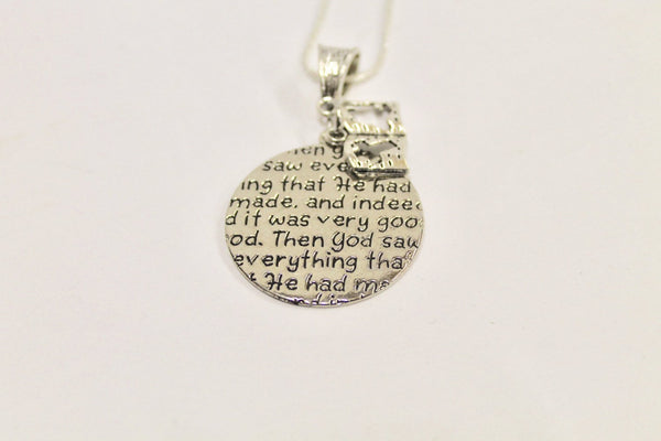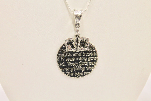 This is a beautiful In The Beginning Genesis Bible pendant available on your choice of 16, 18, 20, 22, 24, 26, 28 or 30 inch sterling silver plated snake chain. The pendant is also available for individual purchase if you have another chain on which you would like to wear it.