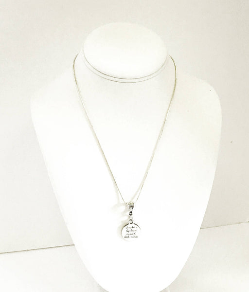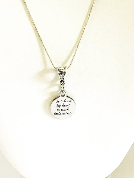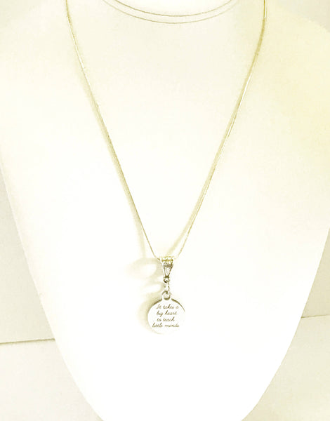 This is a laser engraved stainless steel pendant on a sterling silver plated snake chain. The pendant has the phrase "It Takes A Big Heart To Teach Little Minds". This pendant is available on your choice of 16, 18, 20, 22, 24, 26, 28 or 30 inch chain. The pendant is also available for individual purchase if you have another chain on which you would like to wear it.