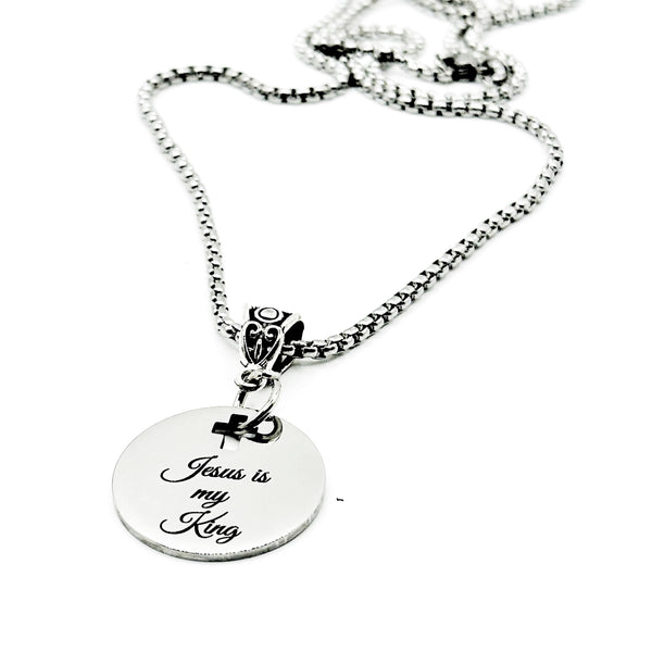 Honor your faith with this stunning stainless steel necklace from JKCE Designs. The round engraved charm reads “Jesus is my King” and measures approximately 25mm, featuring a cross cut-out at the top. The charm is suspended from a high-quality stainless steel rounded box chain available in your choice of lengths, complemented by a beautifully detailed v-shaped bale. Durable, hypoallergenic, and polished to a shine, this necklace is perfect for everyday wear or as a thoughtful Christian gift for birthdays, confirmations, baptisms, or holidays.