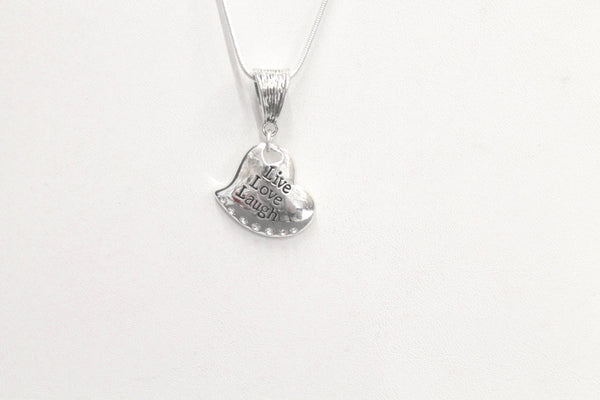 This necklace is a beautiful Live Laugh Love heart silver tone pendant on your choice of a 16, 18, 20, 22, 24, 26, 28 or 30 inch sterling silver plated snake chain. This is a great motivational necklace to use as a reminder to always live, laugh, and love to get the most out of life! It would be a great graduation gift or wedding gift for your daughter!