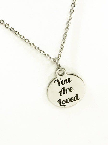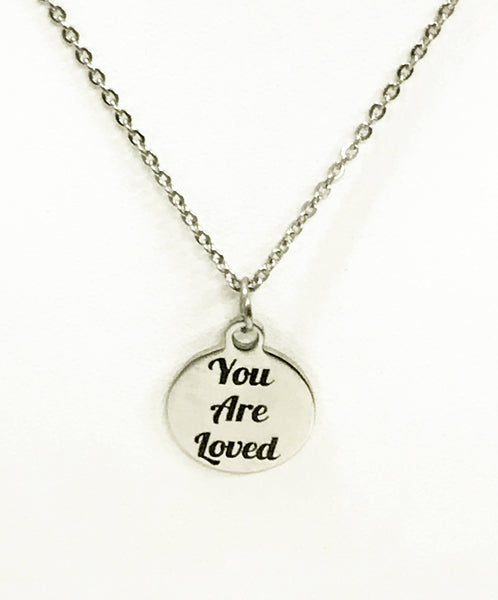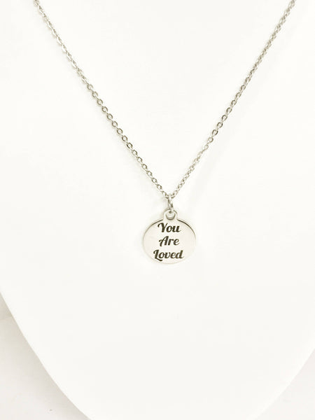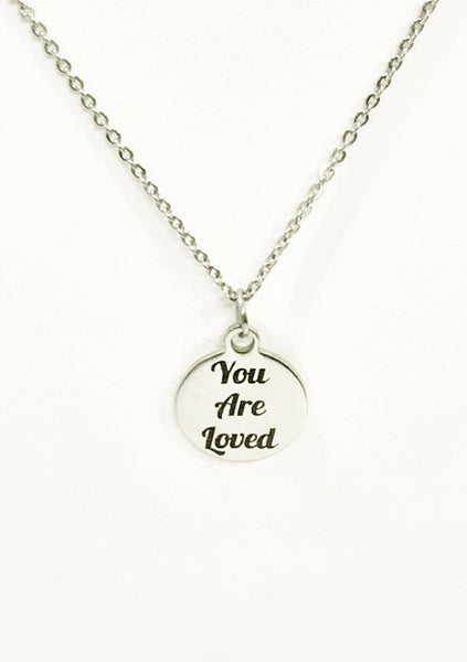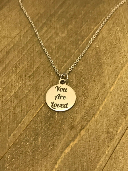 This beautiful necklace is a stainless steel laser engraved pendant with "You Are Loved" on it. The pendant comes on a stainless steel chain. This pendant is available on your choice of 16, 18, 20, 22, 24, 26, 28 or 30 inch chain. The pendant is also available for individual purchase if you have another chain on which you would like to wear it.