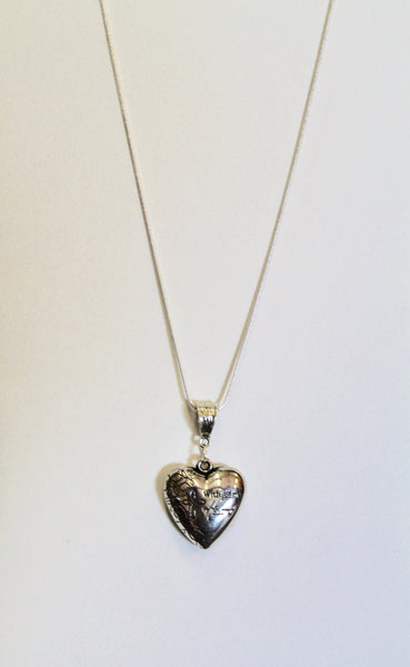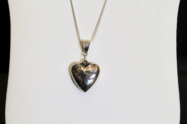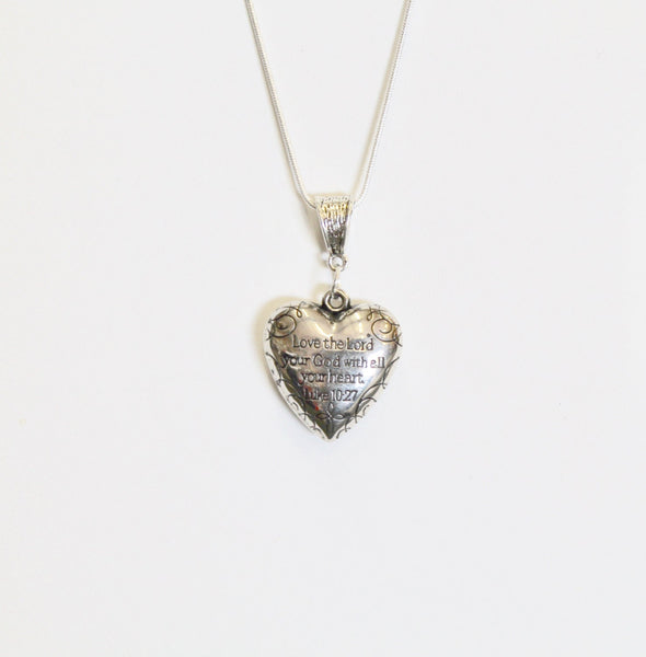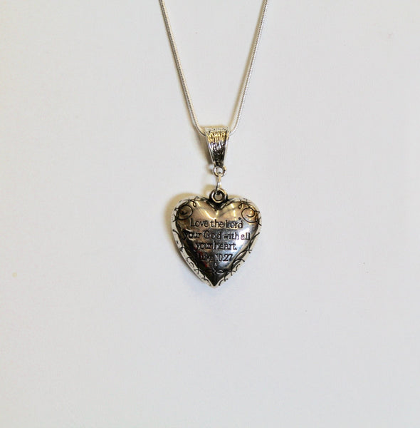 This is a puffed heart silver tone Love The Lord Your God With All Your Heart pendant on a silver plated snake chain to represent the Bible verse of Luke 10:27. This is a double sided pendant with the verse on one side and With All My Heart on the other side. This pendant is available on your choice of 16, 18, 20, 22, 24, 26, 28 or 30 inch silver plated snake chain. The pendant is also available for individual purchase if you have another chain that you would like to wear it on.