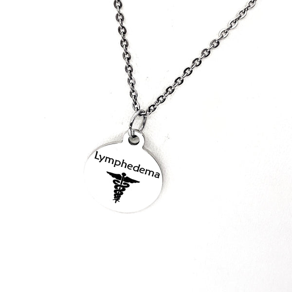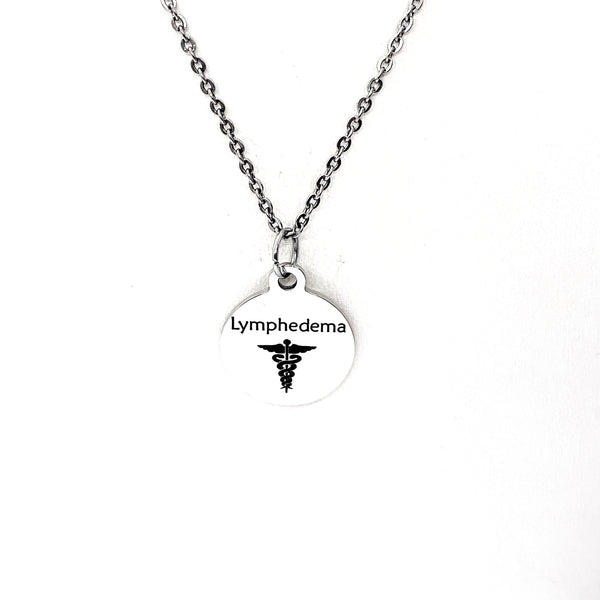 This is a stainless steel laser engraved pendant on a stainless steel chain. The pendant has “Lymphedema” and a medical caduceus symbol on it. This pendant is available on your choice of 16, 18, 20, 22, 24, 26, 28 or 30 inch chain. The pendant is also available for individual purchase if you have another chain on which you would like to wear it. For an additional charge, the charm can be customized to meet your specific needs.