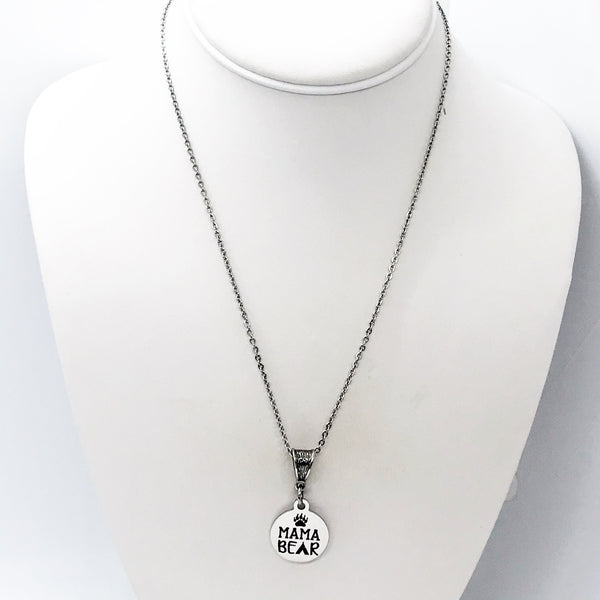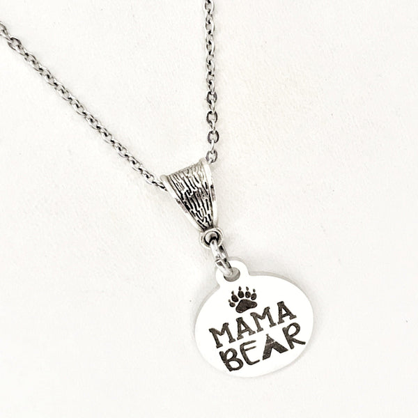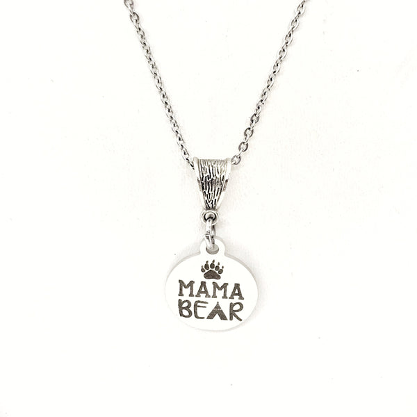 The is a beautiful jewelry piece that has a stainless steel laser engraved charm with “Mama Bear” on it. The charm measures approx. 3/4 inch across.