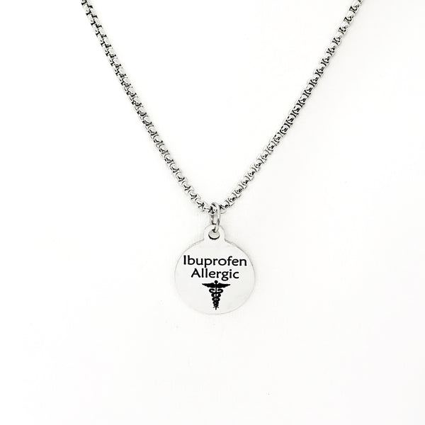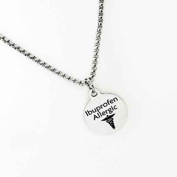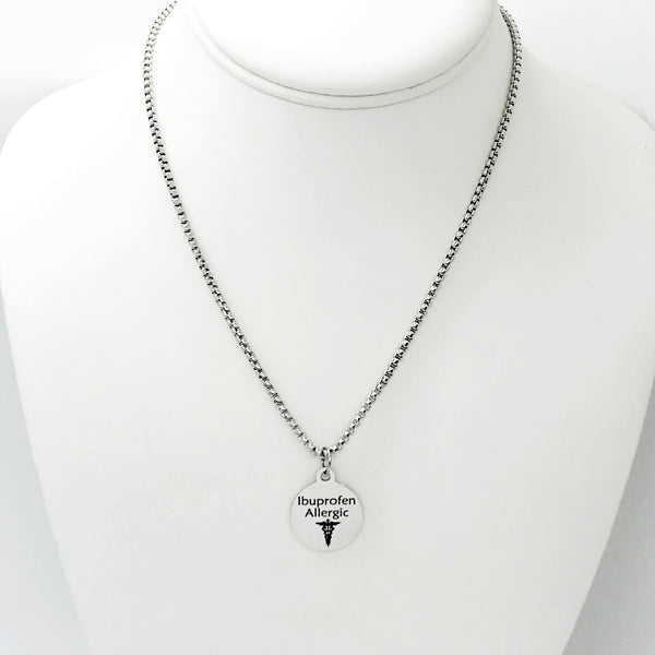 This is 22” stainless steel box chain necklace that would work well for both men and women. It has a stainless steel laser engraved pendant that says “Ibuprofen Allergic”. The charm measures approx. 3/4 inch.