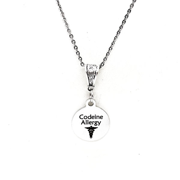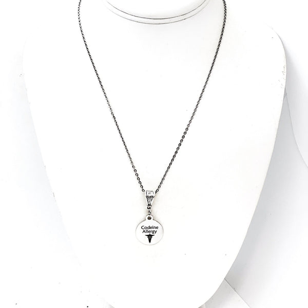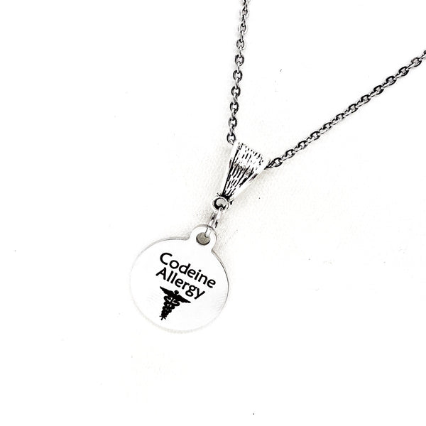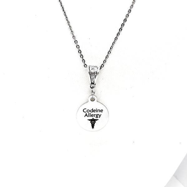 This is a stainless steel laser engraved pendant on a stainless steel link chain. The pendant says “Codeine Allergy” on it.