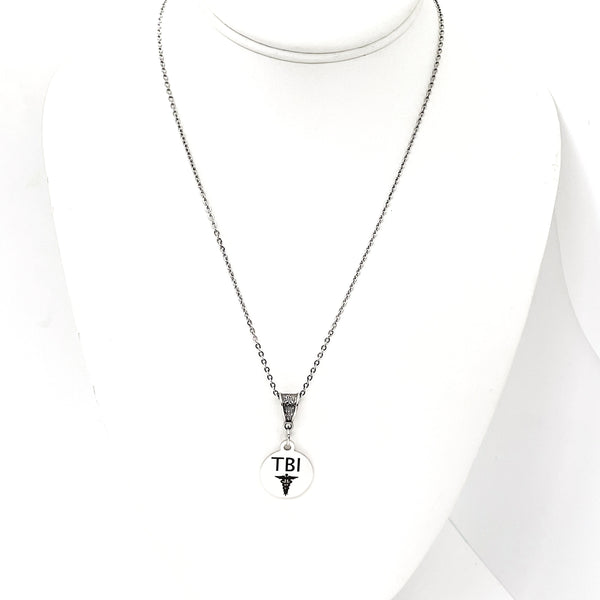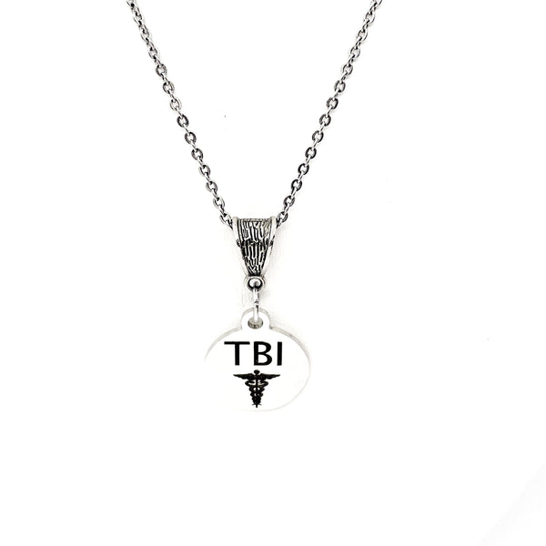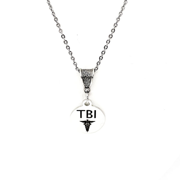 This is a stainless steel laser engraved pendant on a stainless steel link chain. The pendant says “TBI” on it.