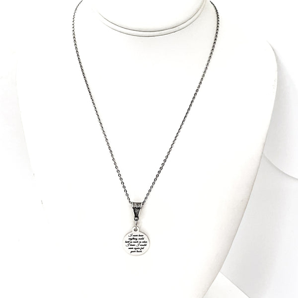 This beautiful necklace would make wonderful gift. It has a laser engraved charm with “I never knew anything could hurt so much as when I knew I would never again feel your touch” on it. The charm measures approx. 3/4 inch across.
