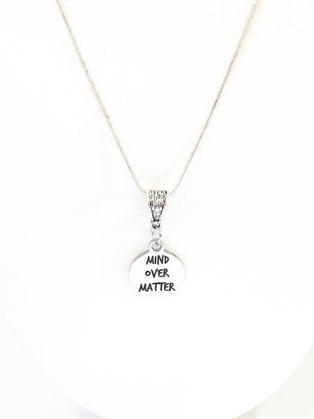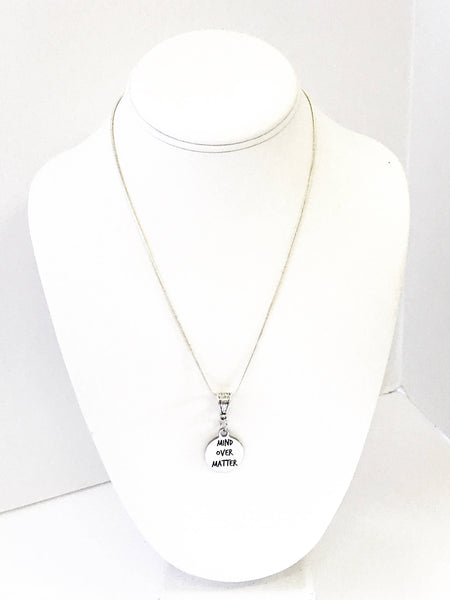 This is a stainlses steel laser engraved pendant on a sterling silver plated chain. The pendant has "Mind Over Matter" on it. This pendant is available on your choice of 16, 18, 20, 22, 24, 26, 28 or 30 inch sterling silver chain. The pendant is also available for individual purchase if you have another chain on which you would like to wear it.