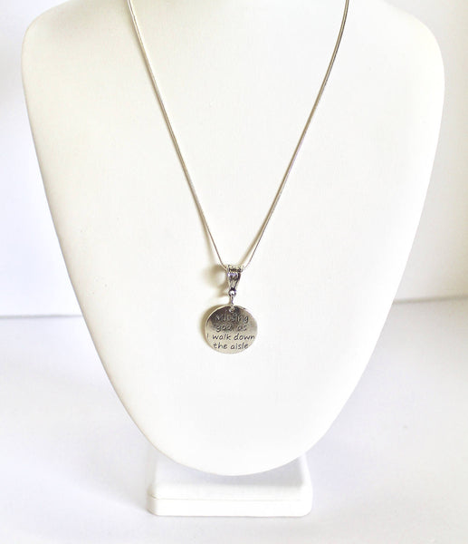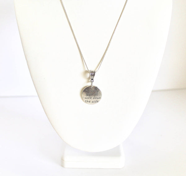 This is a beautiful silver tone pendant with the saying "Missing You As I Walk Down the Aisle" on a sterling silver plated snake chain. This is a beautiful and simple way to remember a loved one that is no longer with you on your wedding day. This pendant is available on your choice of 16, 18, 20, 22, 24, 26, 28 or 30 inch chain.
