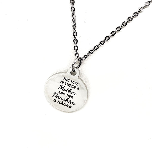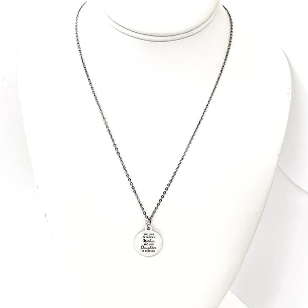 This beautiful necklace would make wonderful gift. It has a laser engraved charm with “The love between a mother and her daughter is forever” on it. The charm measures approx. 3/4 inch across.