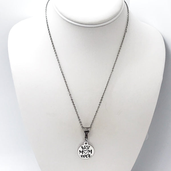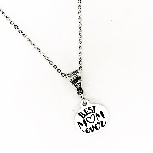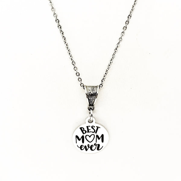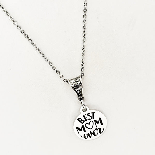 The is a beautiful jewelry piece that has a stainless steel laser engraved charm with “Best Mom Ever” on it. The charm measures approx. 3/4 inch across.