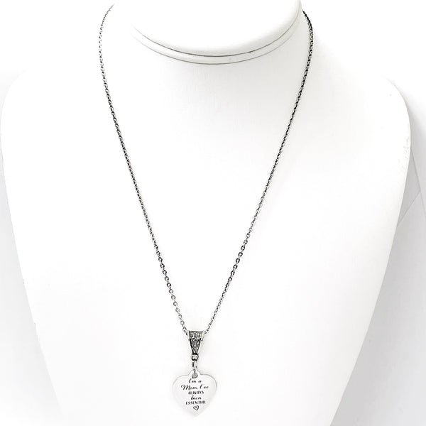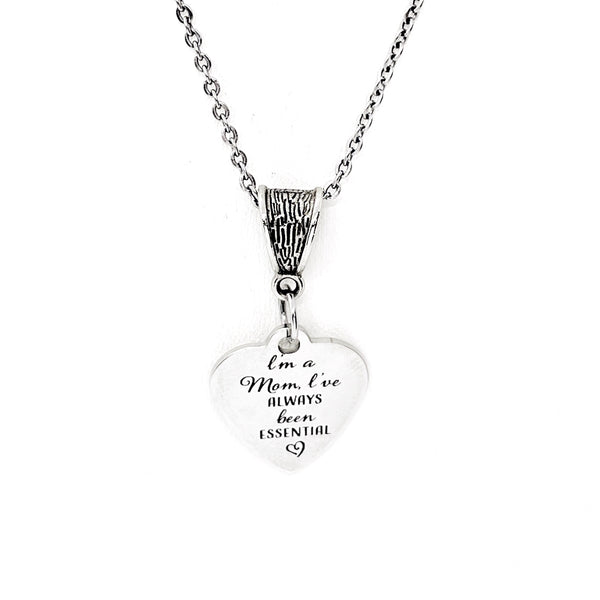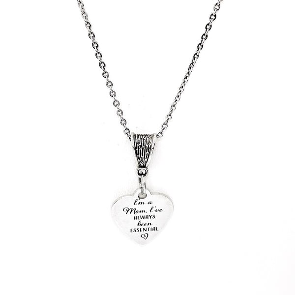 This is a stainless steel laser engraved pendant on a stainless steel link chain chain. The pendant says “I’m a mom, I’ve always been essential.”