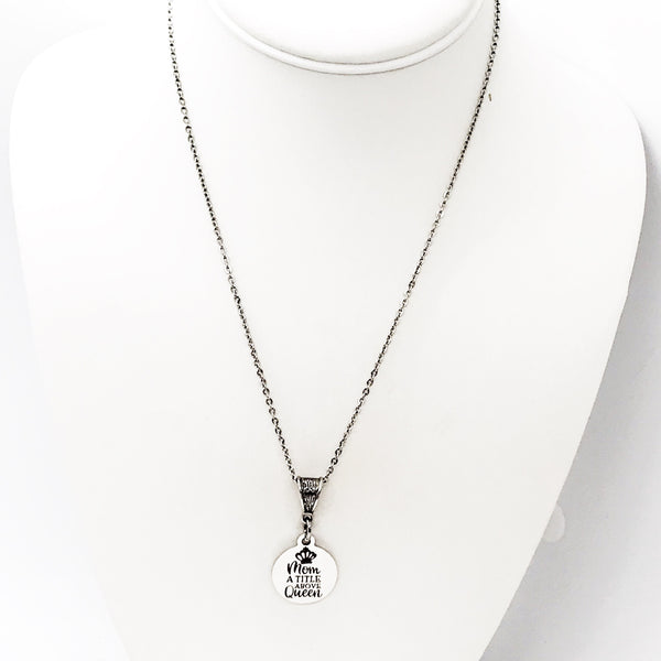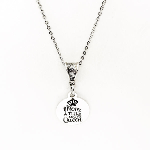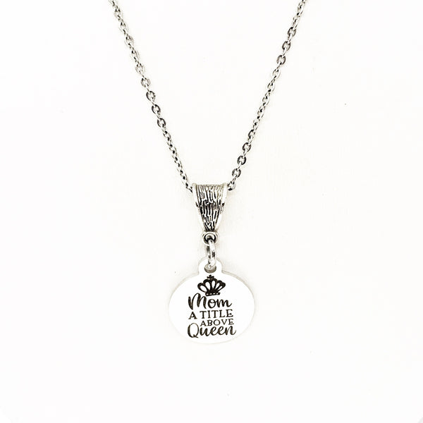 The is a beautiful jewelry piece that has a stainless steel laser engraved charm with “Mom A Title Above Queen” on it. The charm measures approx. 3/4 inch across.