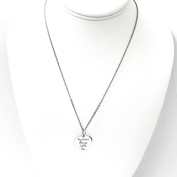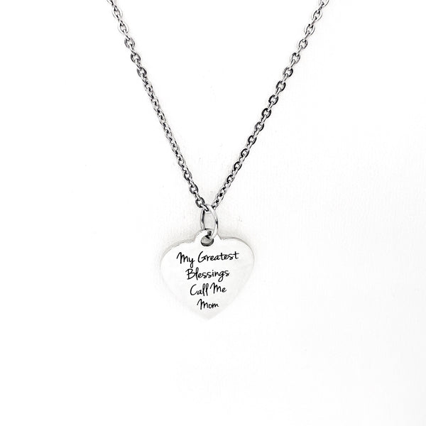 This is a stainless steel laser engraved pendant on a stainless steel chain. The pendant has “My greatest blessings call me Mom” on it. This pendant is available on your choice of 16, 18, 20, 22, 24, 26, 28 or 30 inch chain. The pendant is also available for individual purchase if you have another chain on which you would like to wear it. For an additional charge, the charm can be customized to meet your specific needs.
