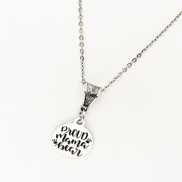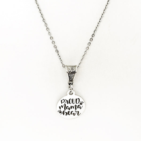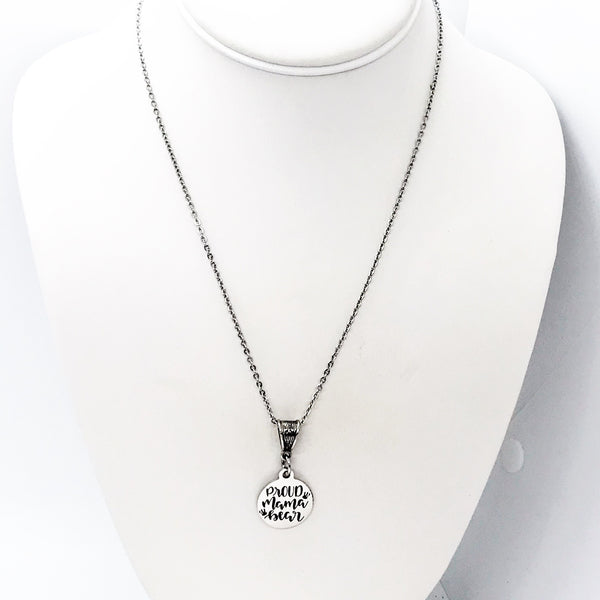 The is a beautiful jewelry piece that has a stainless steel laser engraved charm with “Proud Mama Bear” on it. The charm measures approx. 3/4 inch across.