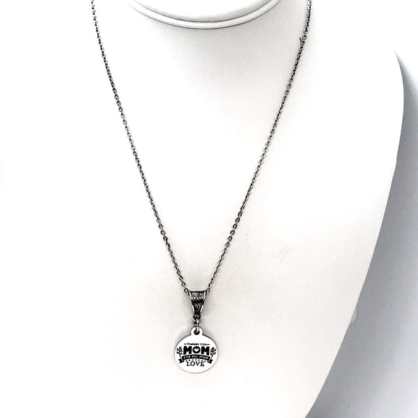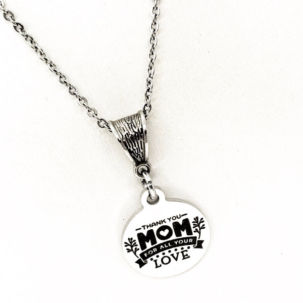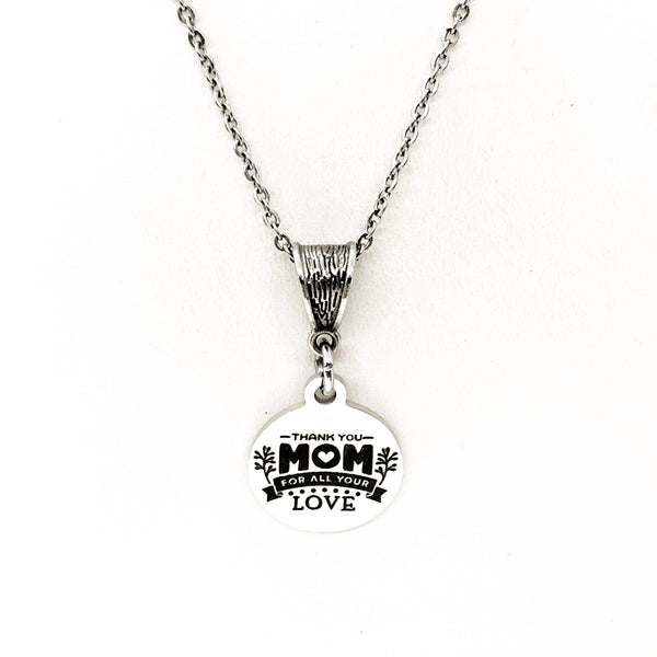 The is a beautiful jewelry piece that has a stainless steel laser engraved charm with “Thank you Mom For All Your Love” on it. The charm measures approx. 3/4 inch across.
