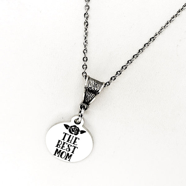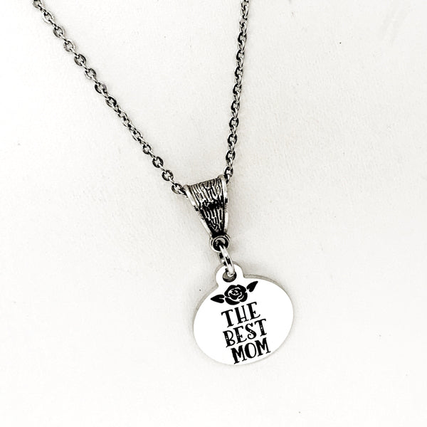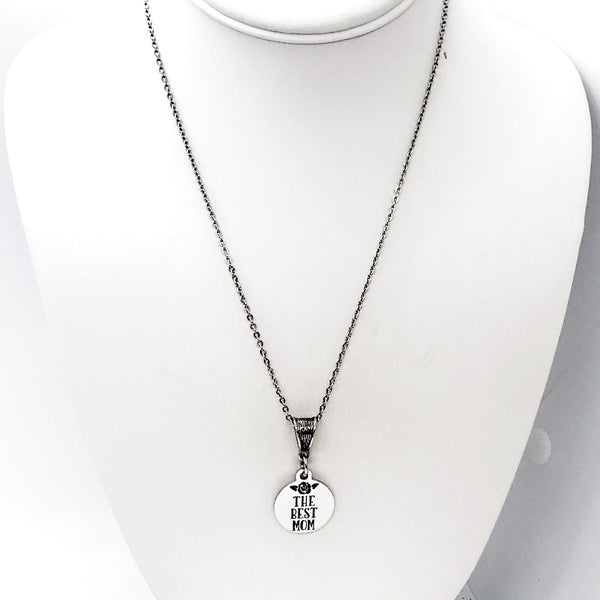 The is a beautiful jewelry piece that has a stainless steel laser engraved charm with “The Best Mom” on it. The charm measures approx. 3/4 inch across.
