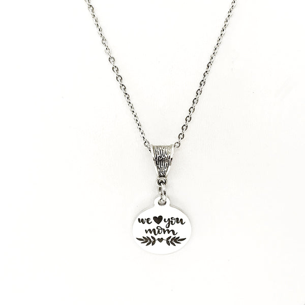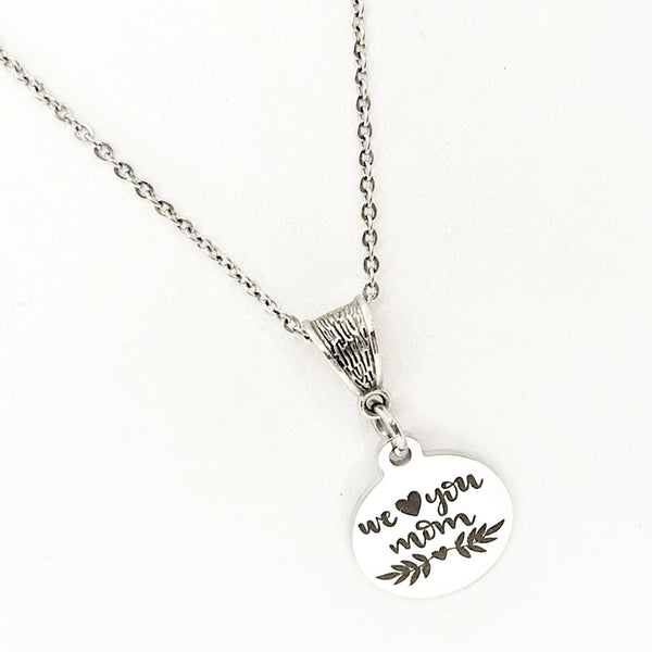 This necklace is a simple but beautiful gift for a loved one in your life. It is a stainless steel laser engraved charm on a stainless steel link chain with a silver-tone bale. The charm has “We love you Mom” on it.