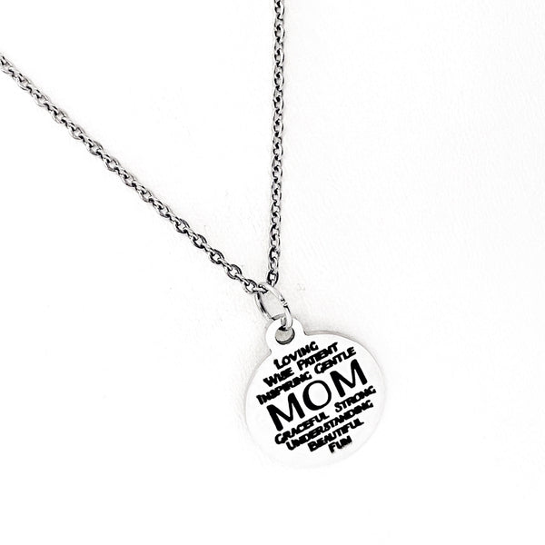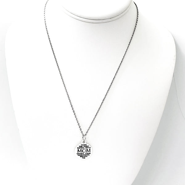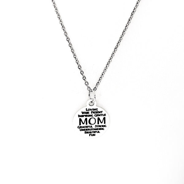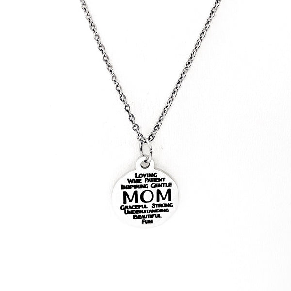 This is a stainless steel laser engraved pendant on a stainless steel chain. The pendant has “Mom - Loving Wise Patient Gentle Graceful Strong Understanding Beautiful Fun” on it. The pendant measures approx. 3/4 inch across. This pendant is available on your choice of 16, 18, 20, 22, 24, 26, 28 or 30 inch chain. The pendant is also available for individual purchase if you have another chain on which you would like to wear it. For an additional charge, the charm can be customized to meet your specific needs.