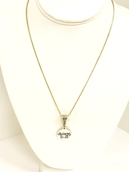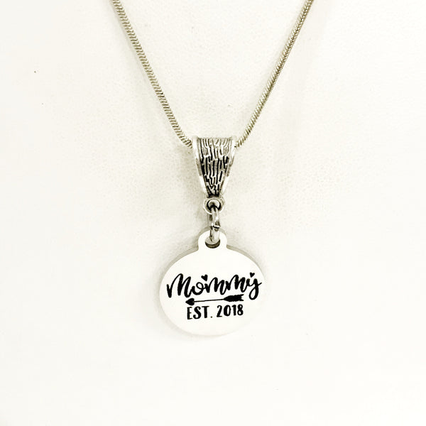 This beautiful necklace would be a great gift for a first time mom. It has a stainless steel laser engraved charm with “Mommy EST 2018” on it.