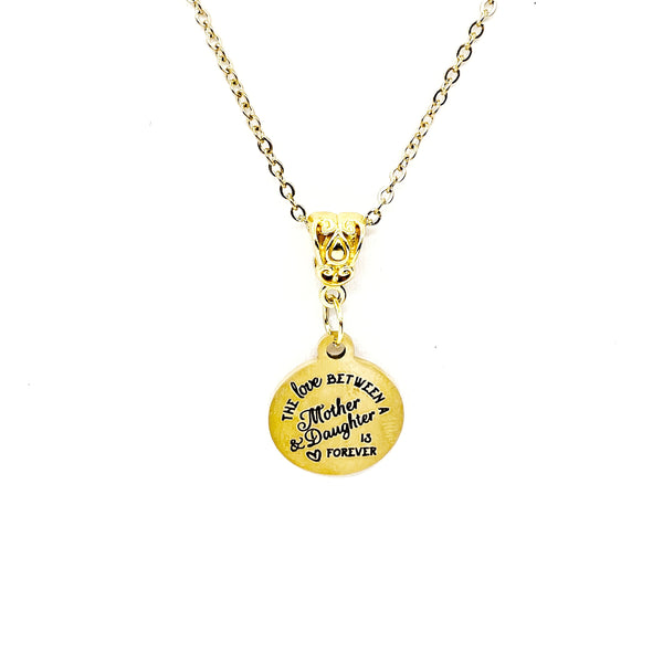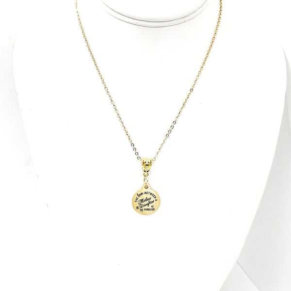 This is a Gold-plated brass necklace with a Gold-plated stainless steel laser engraved pendant with "The love between a mother and daughter is forever" on it. This pendant is available on your choice of 16, 18, 20, 22, 24, 26, 28 or 30 inch chain.