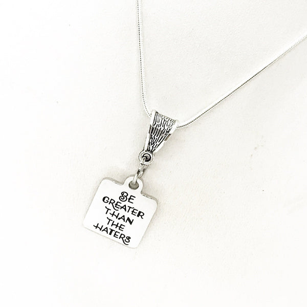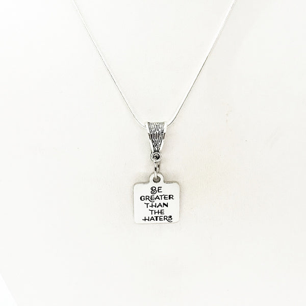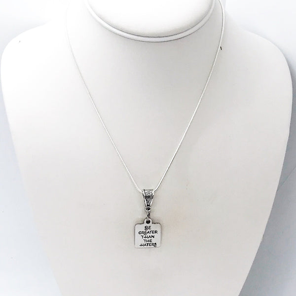 This is a stainless steel laser engraved pendant on a silver-plated snake chain. The pendant has "Be Greater Than The Haters" on it. This pendant is available on your choice of 16, 18, 20, 22, 24, 26, 28 or 30 inch chain. The pendant is also available for individual purchase if you have another chain on which you would like to wear it.