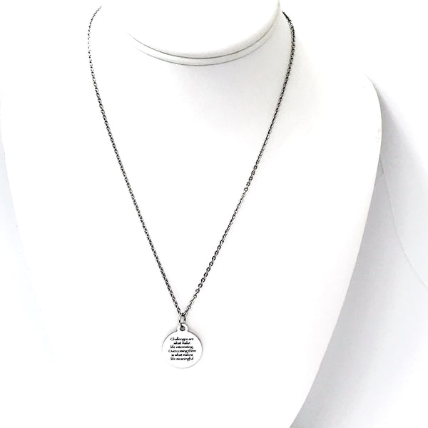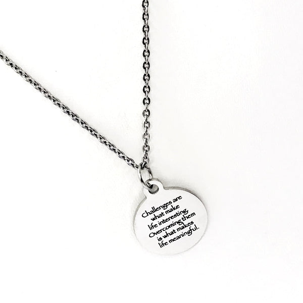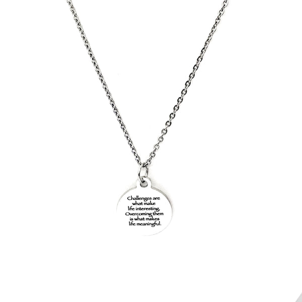This is a simple but classic gift pendant necklace. The pendant is a stainless steel laser engraved charm that has “Challenges are what make life interesting. Overcoming them is what makes life meaningful.” on it. This pendant is available on your choice of 16, 18, 20, 22, 24, 26, 28 or 30 inch chain. The pendant is also available for individual purchase if you have another chain on which you would like to wear it. The pendant measures approx. 3/4 inch across.