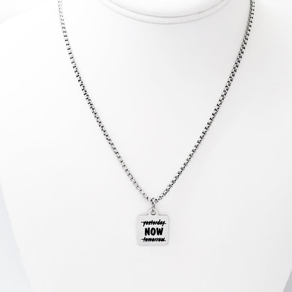 This is 22” stainless steel box chain necklace that would work well for both men and women. It has a stainless steel laser engraved pendant that says “Now”. The charm measures approx. 3/4 inch.