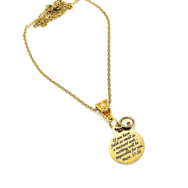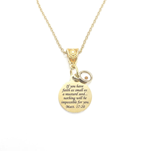 This beautiful necklace would make wonderful gift to remind someone of the scripture of Matthew 17:20 that tells us that with faith the size of a mustard seed, we can move mountains. It is a gold-plated stainless steel charm with “If you have faith as small as a mustard seed… nothing will be impossible for you” on it.